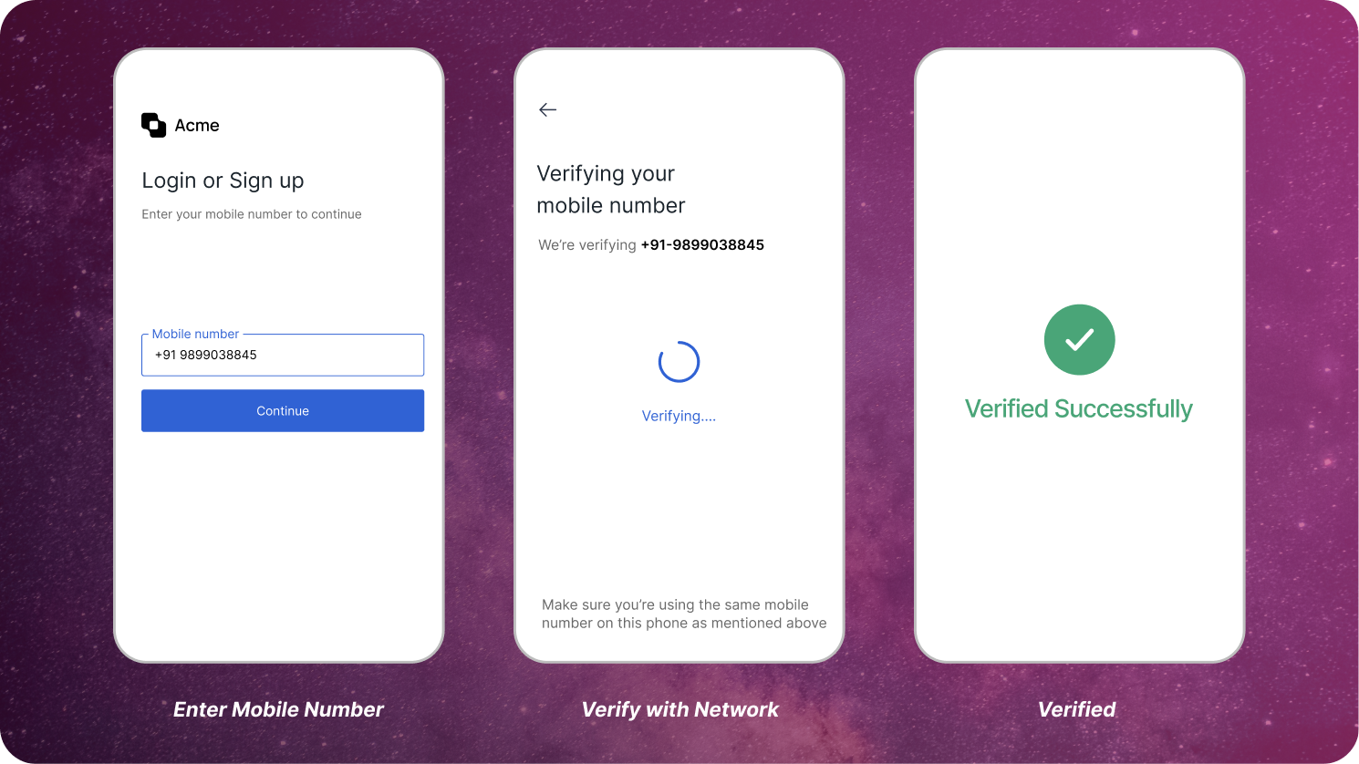 SNA is an authentication method available at user signup, login, or during a high-risk transaction. It confirms that a user’s SIM (Subscriber Identity Module) is actively connected to the mobile network and not being spoofed or cloned. SNA uses standardized GSM (Global System for Mobile Communications) authentication, a proven technology backed by decades of industry trust.Key Requirement: To initiate SNA, the user’s session must connect via mobile data, not Wi-Fi. This ensures that the underlying GSM authentication process can take place seamlessly. For mobile browsers, users may need to switch off Wi-Fi; mobile apps can enforce a cellular-only data connection programmatically.